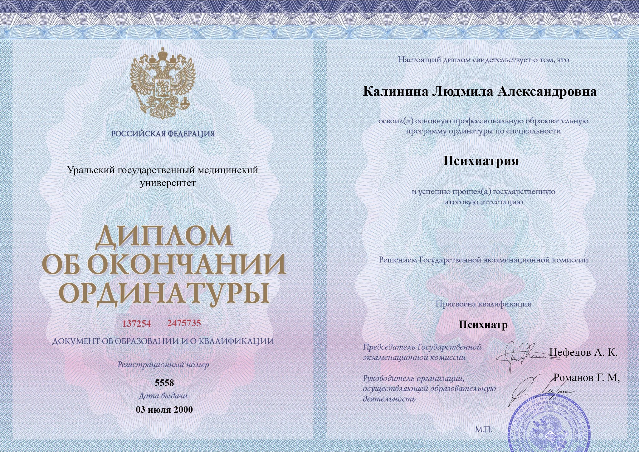 • Российский национальный исследовательский медицинский университет имени Н.И. Пирогова (Психиатрия-наркология).